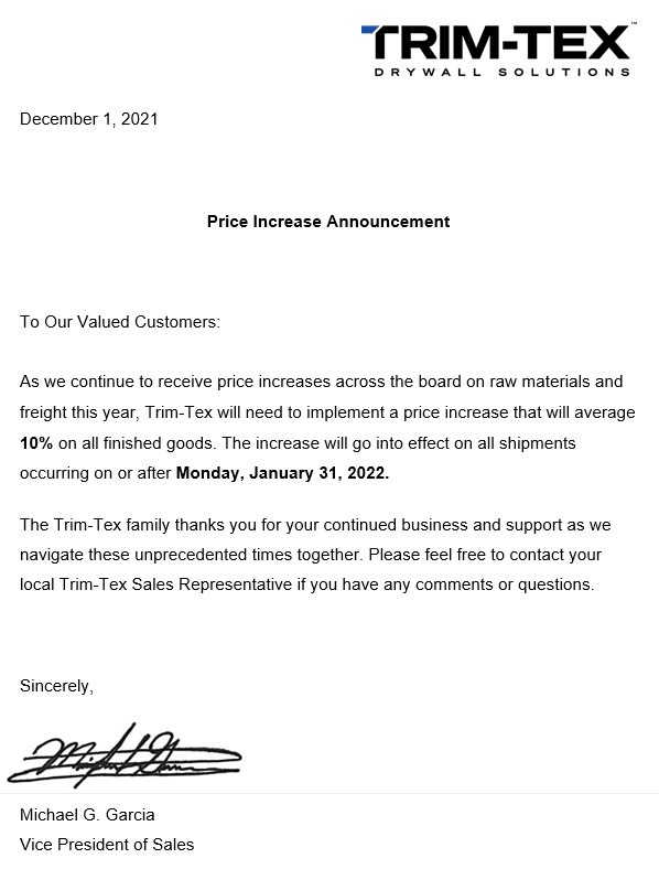 On December 1, 2021, Trim-Tex announced that due to the continued price increases across the board on raw materials and freight in 2021, they will implement a price inc rease that will average 10% on all finished goods.